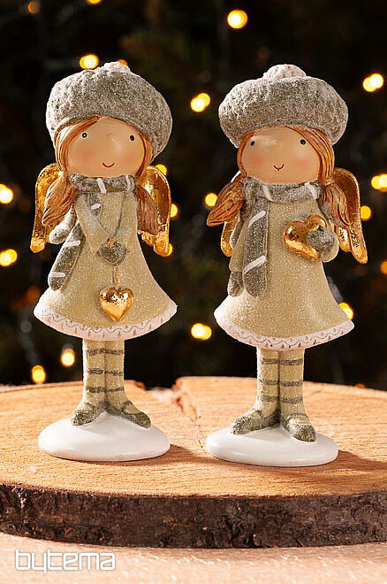 Due angeli con un basco che ricorda una ghianda di un albero. La statuina della fata è in realtà una bambola con le trecce, che tiene un cuore tra le mani. Il suo vestito è scintillante con un bordo in pizzo. Le ali e il cuore sono dorati. Offriamo gli angeli in un mix: uno porta un cuore sul petto e l'altro ha un cuore calato su un filo fino al vestito. Entrambi gli angeli sorridono ed evocano un'atmosfera invernale e natalizia.