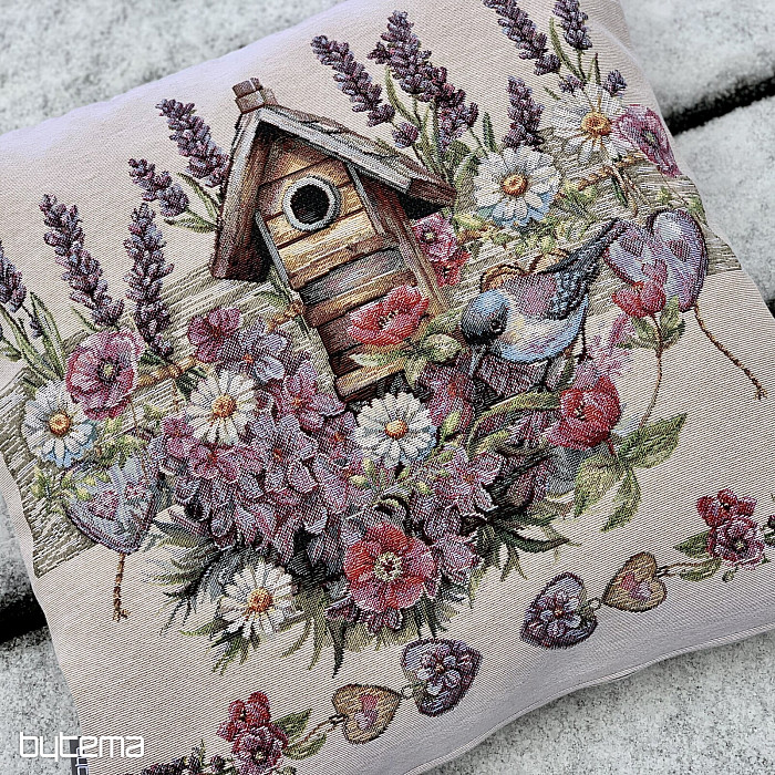Federa arazzo con casetta per uccelli, uccellino e delicata lavanda. Il design raffinato e raffinato di questa federa è perfetto come decorazione per la casa durante tutto l'anno.