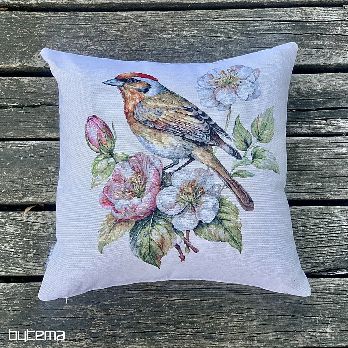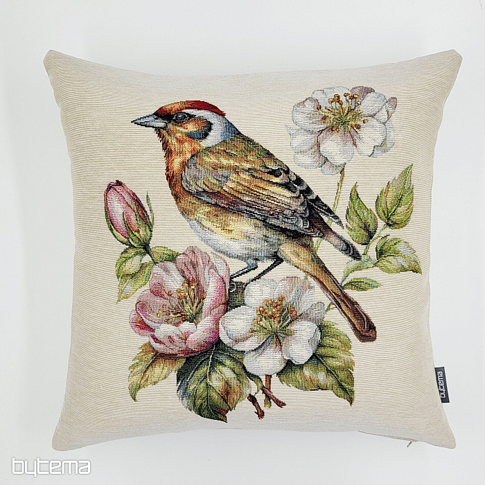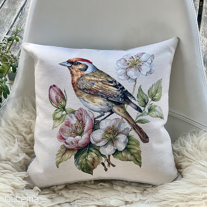Una federa in arazzo con un cardellino su un melo in fiore sarà una splendida decorazione per dare il benvenuto alla primavera.