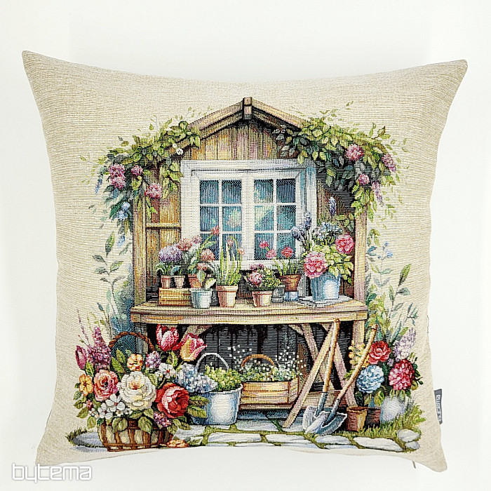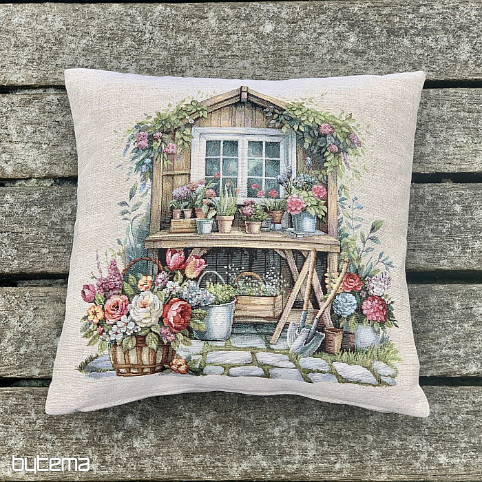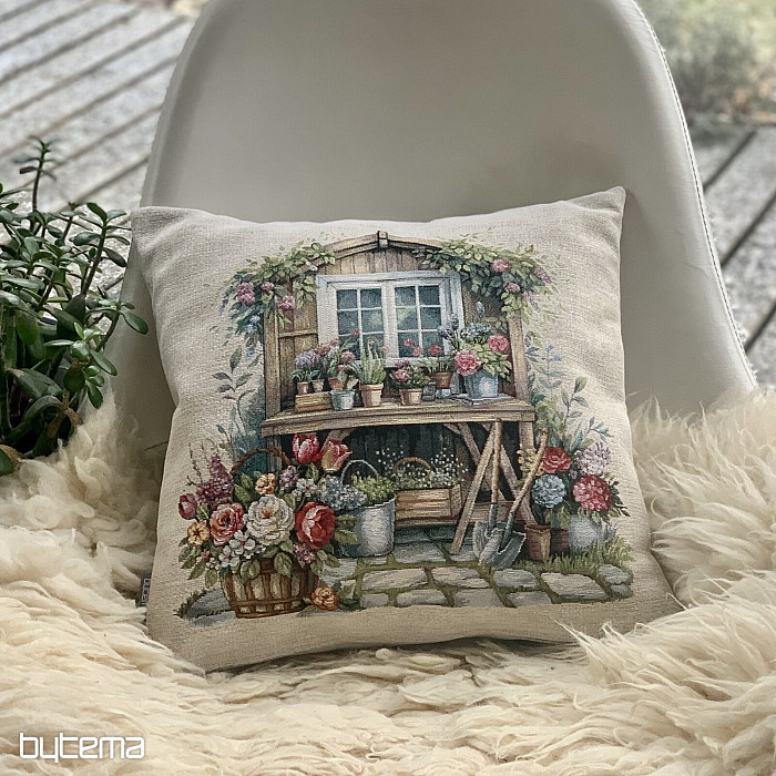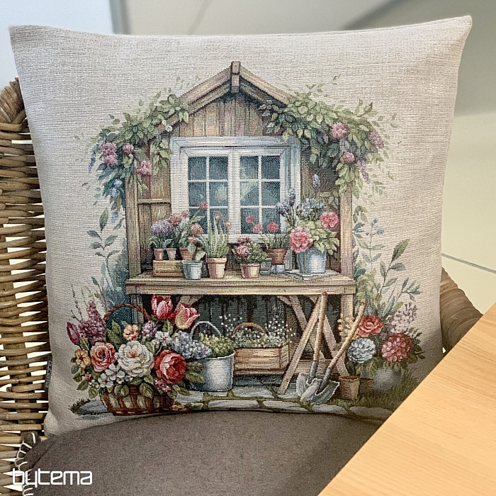 Federa con motivo arazzo raffigurante una casetta da giardino piena di fiori. Il motivo sulla fodera trasmette comfort e calore primaverili.