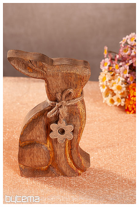 Decorazione per le festività primaverili. Il coniglietto è alto 18 cm ed è realizzato a mano in legno di mango. Ha un fiore di metallo al collo, simbolo della primavera, quando tutto inizia a sbocciare.