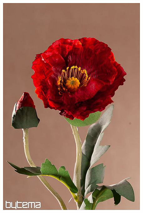 Un papavero con un fiore rosso e un bocciolo. Ha diverse foglie su uno stelo lungo 69 cm. Il fiore è facilmente confondibile con quello vero che cresce nei prati e nei campi a causa della sua lavorazione.