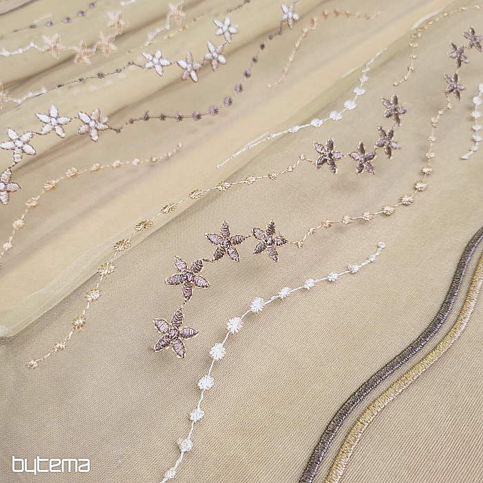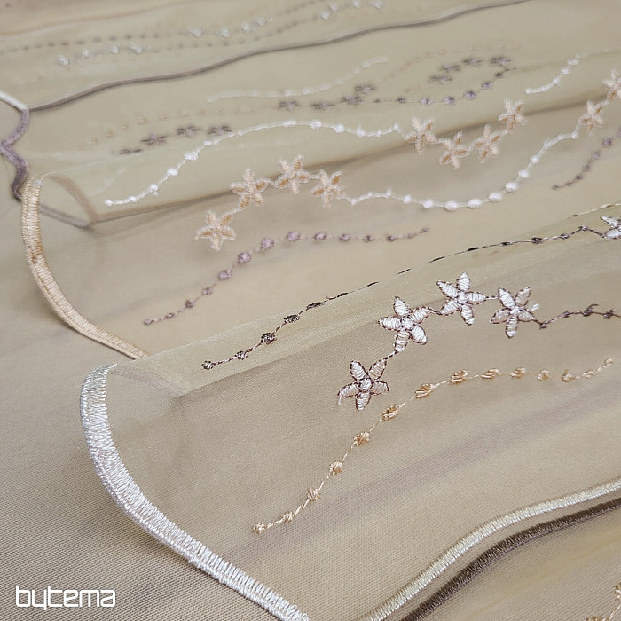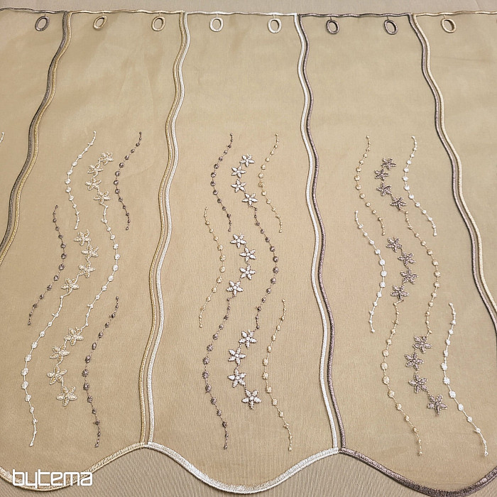 Tenda corta, moderna, in vetro colorato, ricamata, color marrone. Il colore di sfondo marrone e i fiori ricamati aggiungono bellezza alla tenda.
