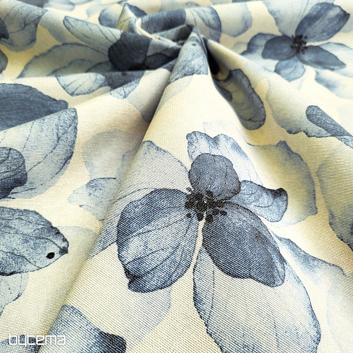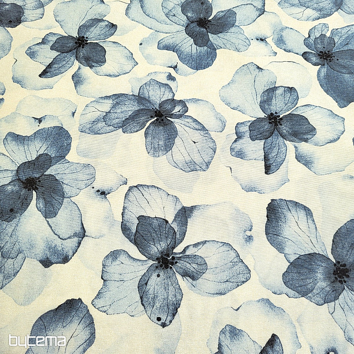 Tessuto decorativo con grandi fiori nelle tonalità del blu.