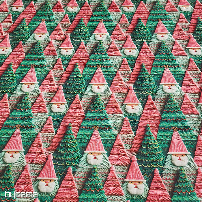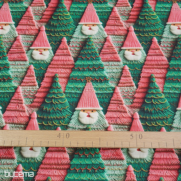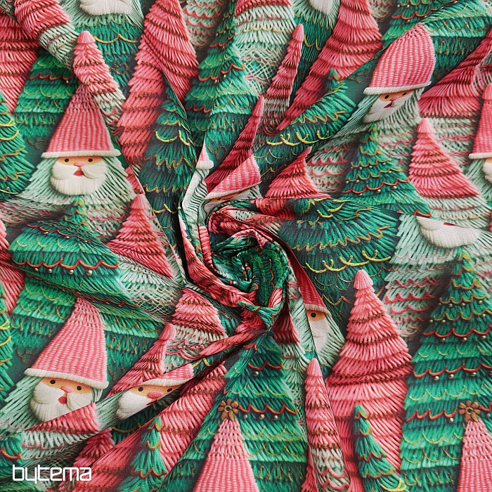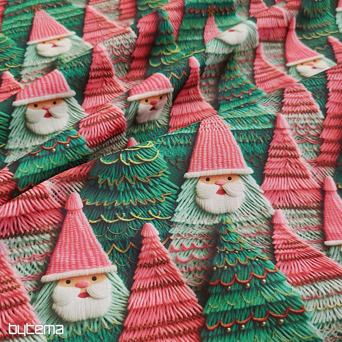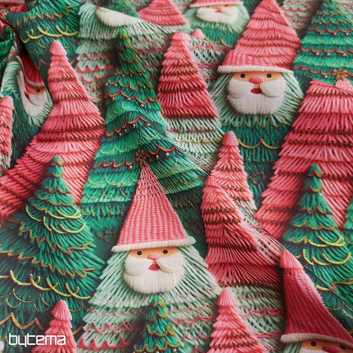 Tessuto decorativo natalizio con il simpatico volto dell'elfo Arthur perso nella foresta. Il tessuto è adatto per cucire tovaglie, tende e federe.