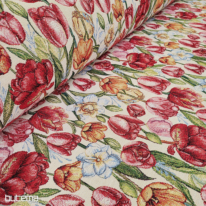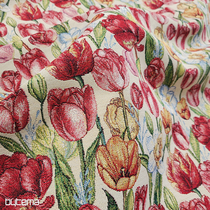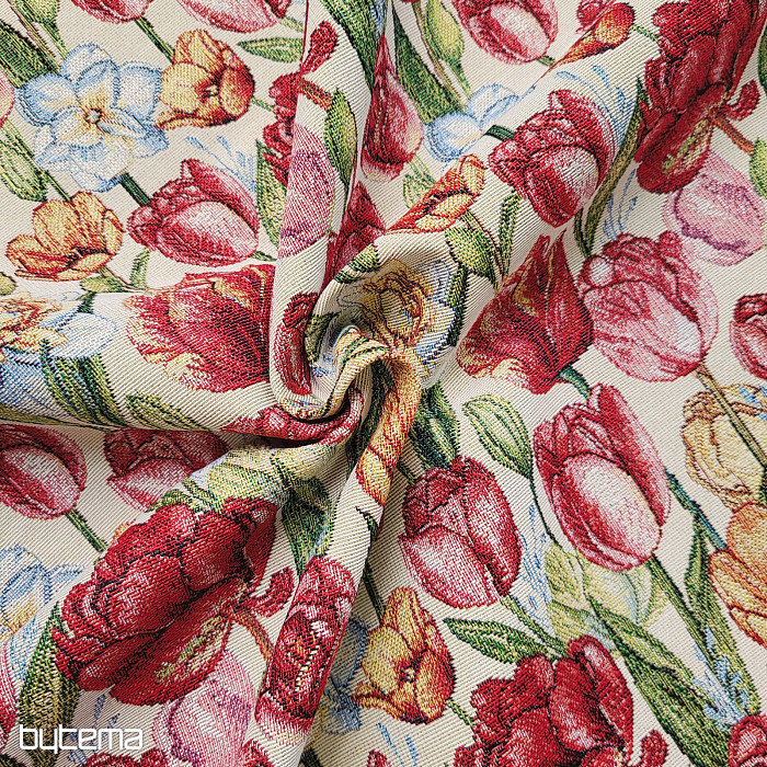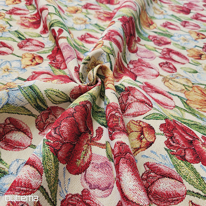 Bellissimo tessuto da arazzo con fiori primaverili di tulipani e narcisi. Una meravigliosa e colorata ondata di fiori e primavera sulla tua tavola di casa.