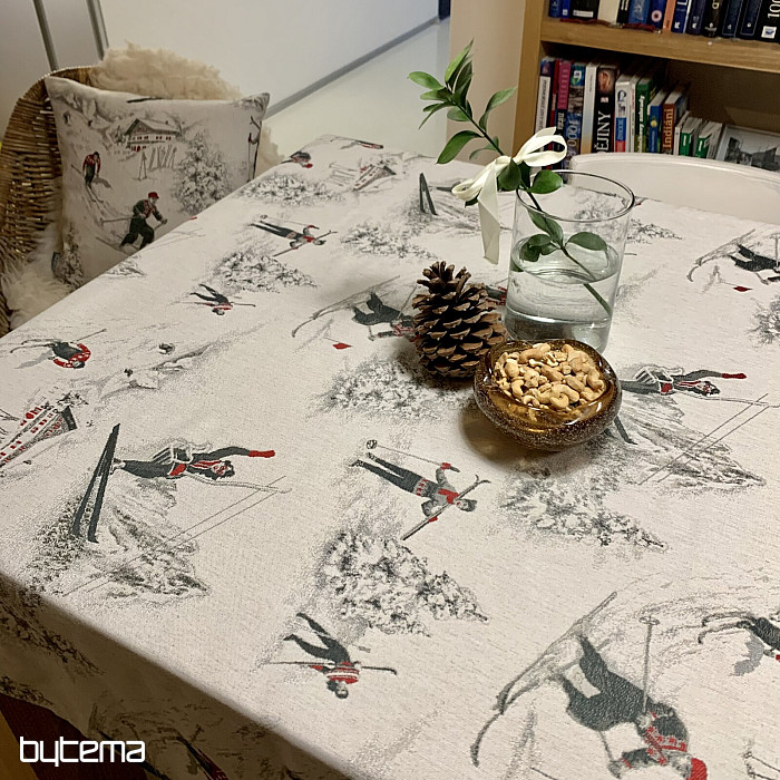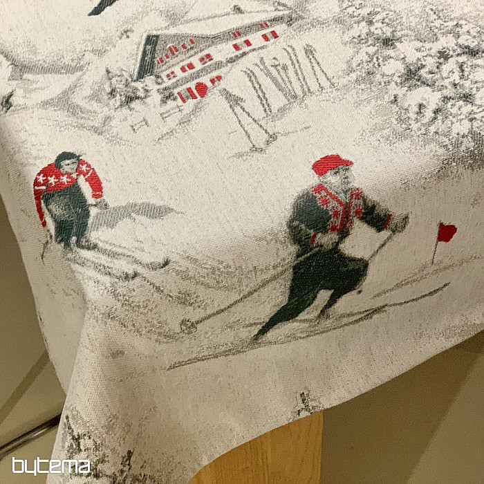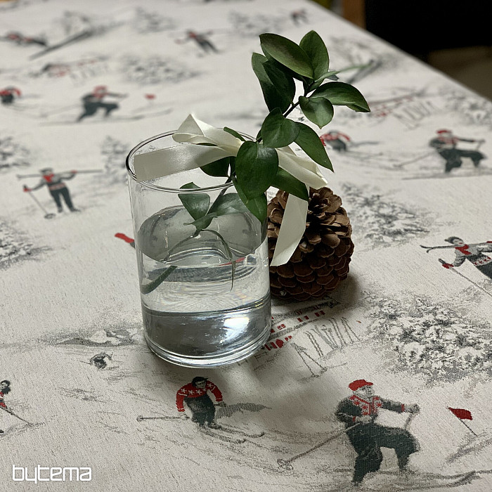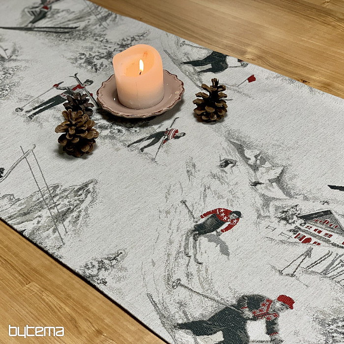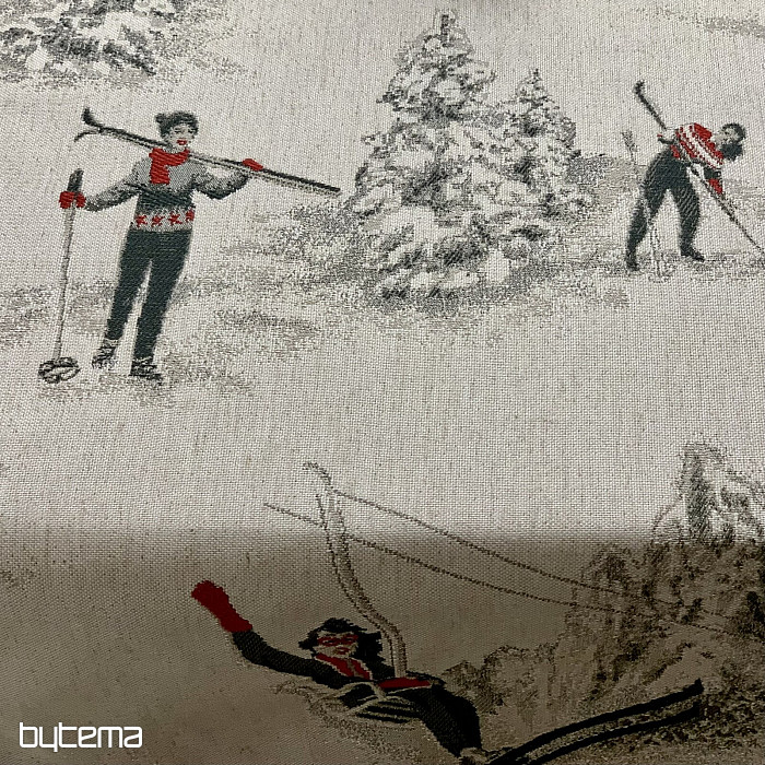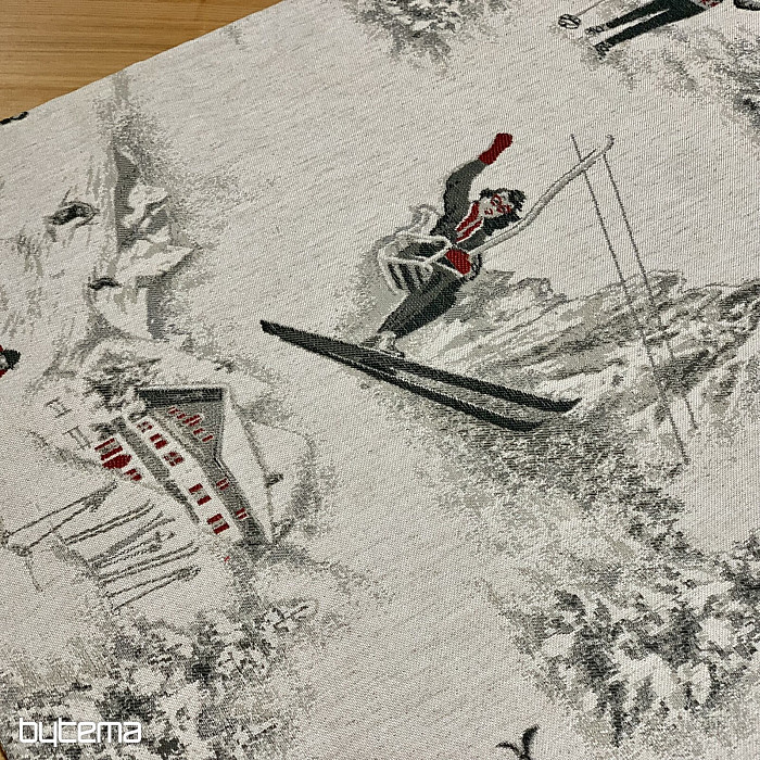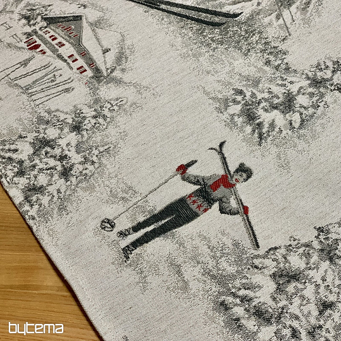 Lo sci invernale e tutto ciò che lo circonda è il motivo principale di questo lussuoso tessuto. Si adatta perfettamente a qualsiasi tavolo dei rifugi di montagna o delle baite in legno.