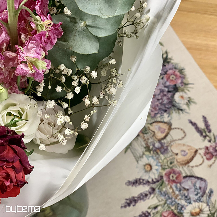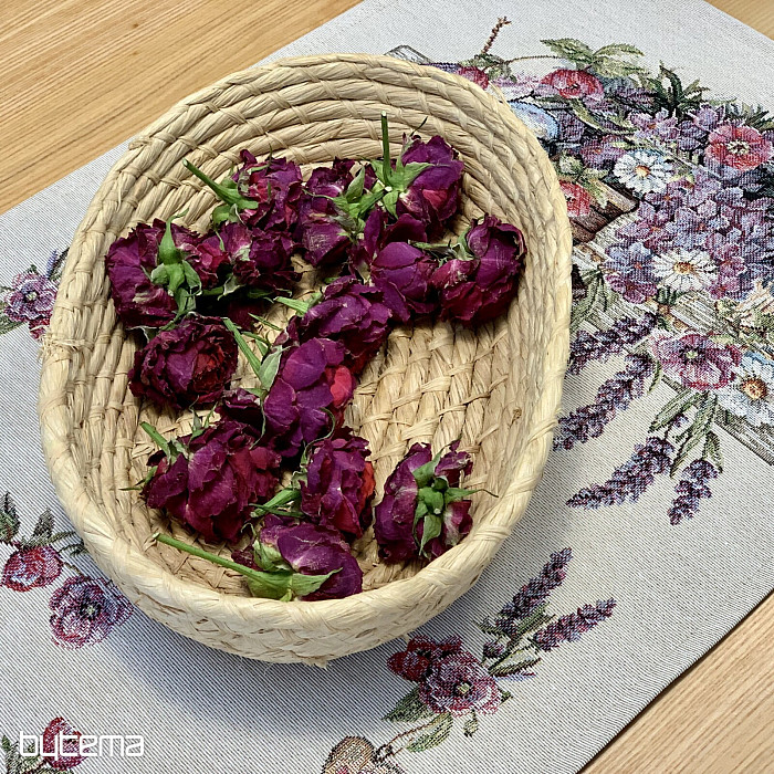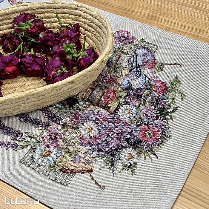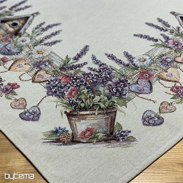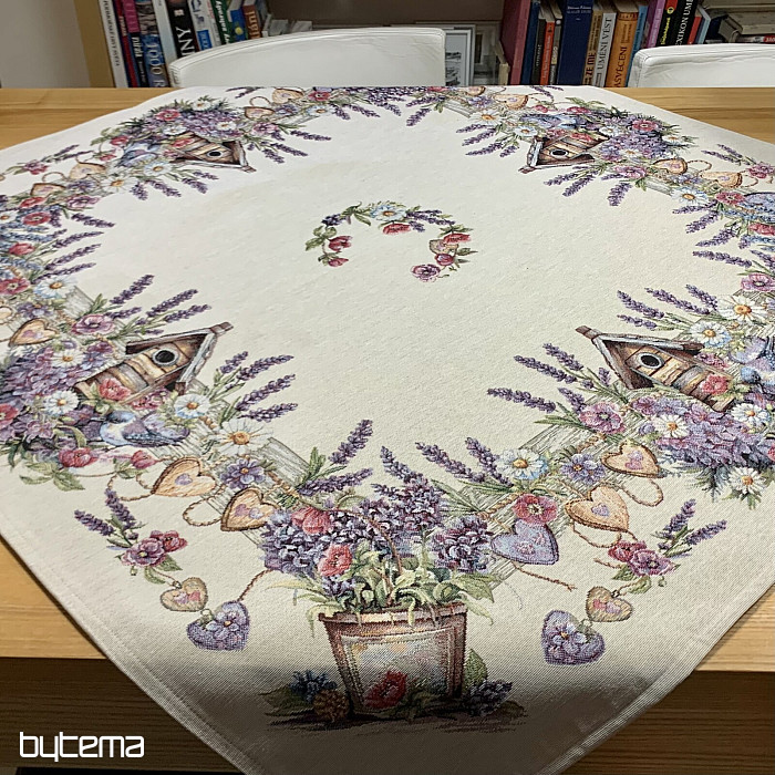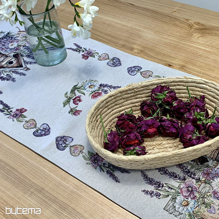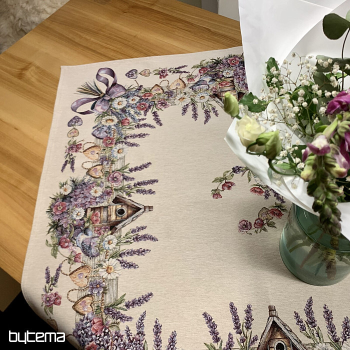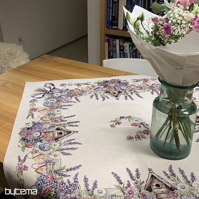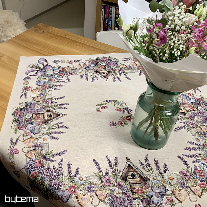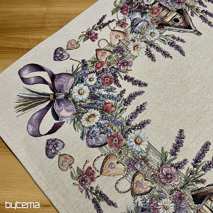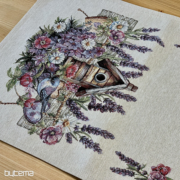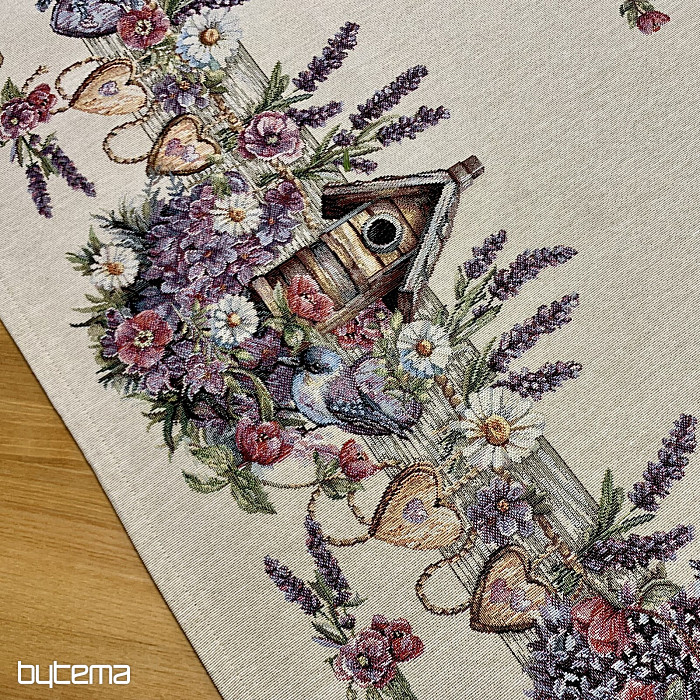 Tovaglia o sciarpa in arazzo con una casetta per uccelli, un uccello e delicata lavanda. Un design splendido e delicato che vi delizierà tutto l'anno.