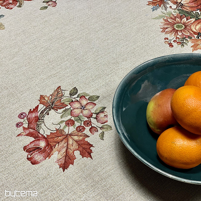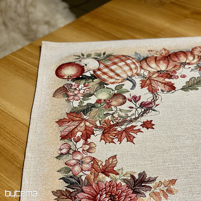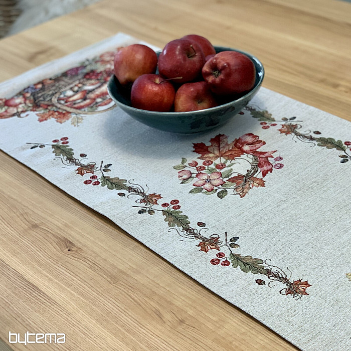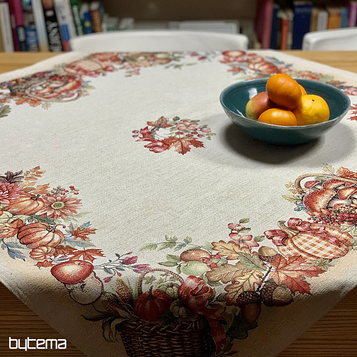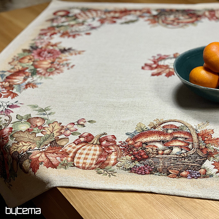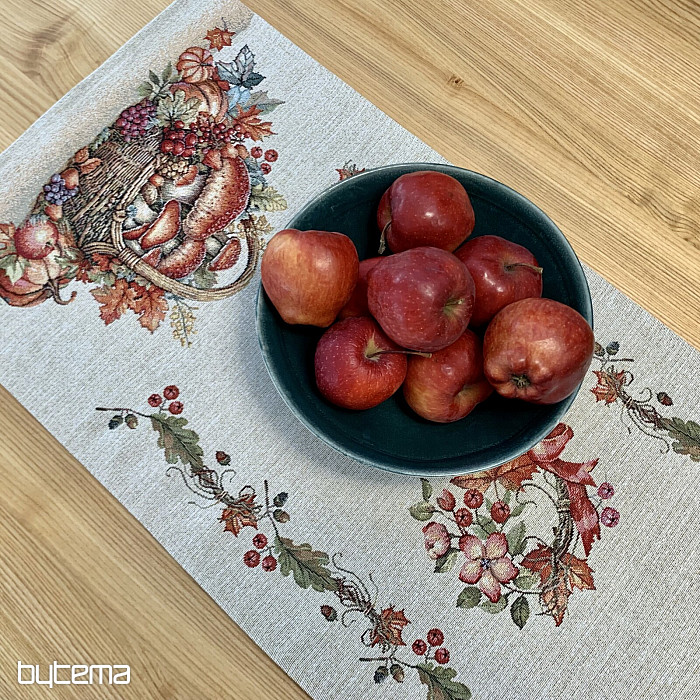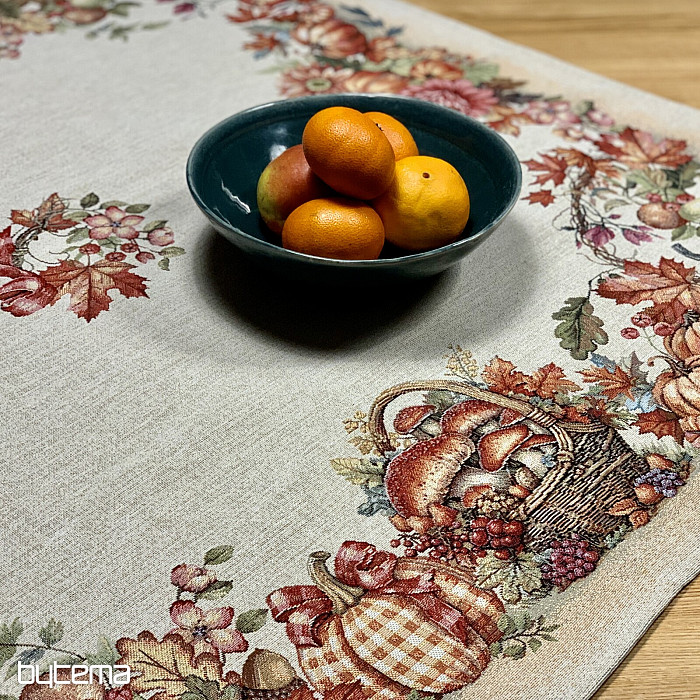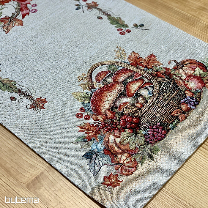 Una tovaglia e una sciarpa con un motivo di frutta e funghi creeranno un'atmosfera piacevole.