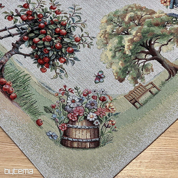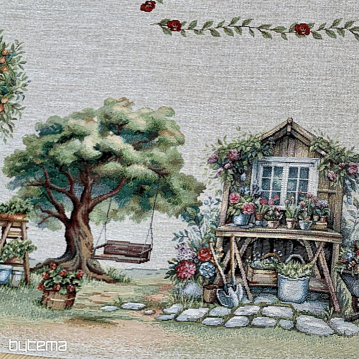 Una tovaglia e una sciarpa in arazzo con una casetta da giardino piena di fiori. A prima vista, il motivo trasmette un senso di comfort e calore primaverili.