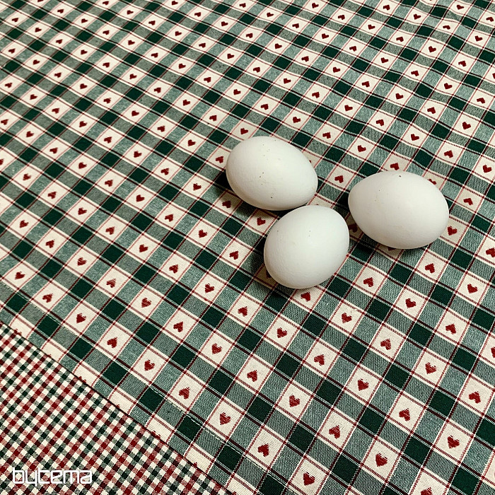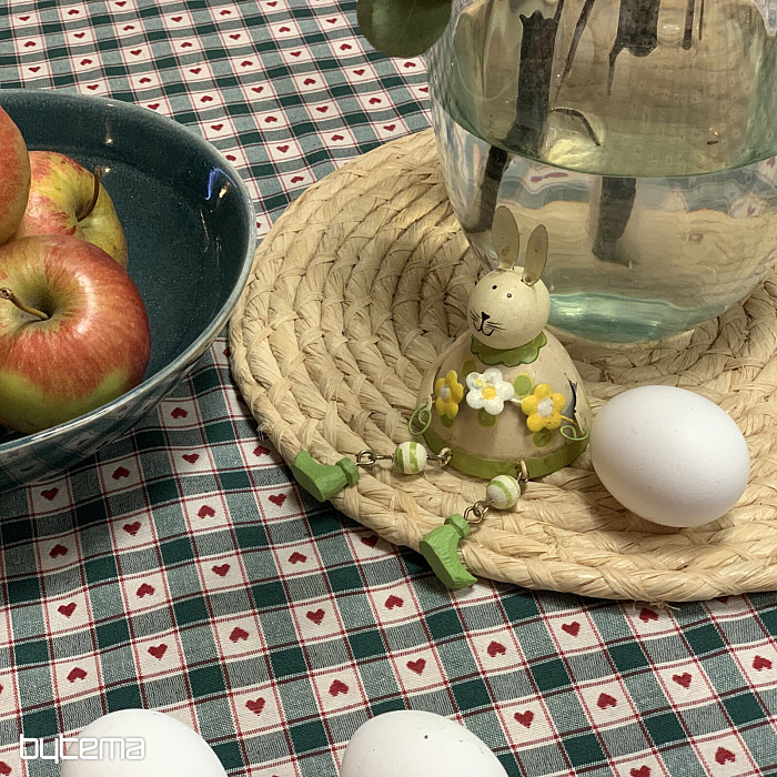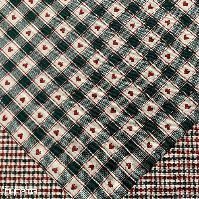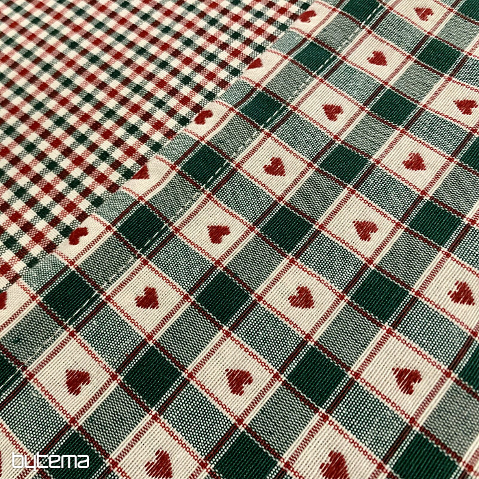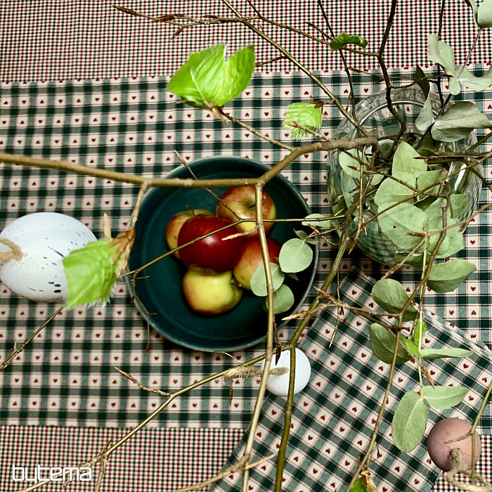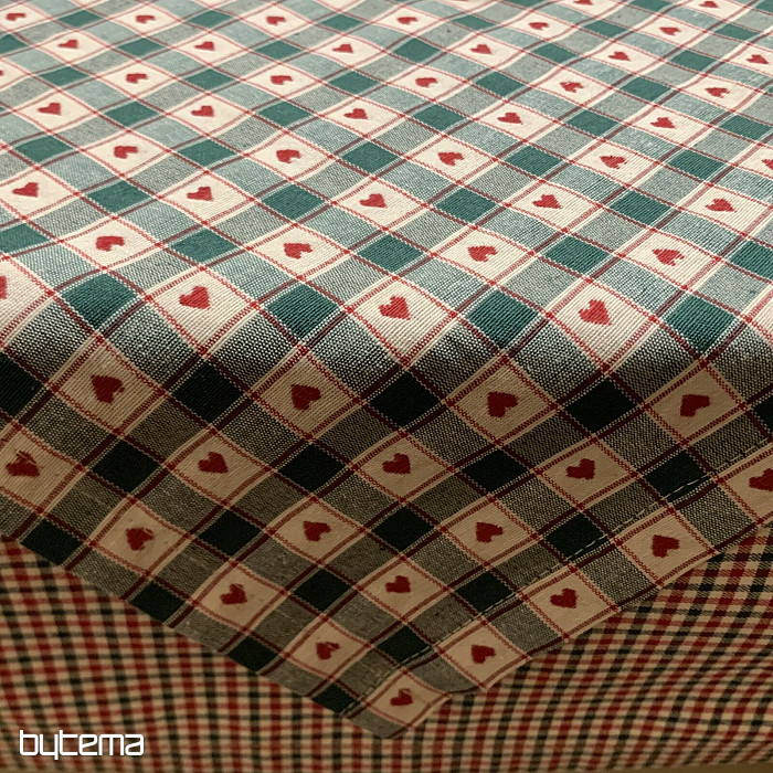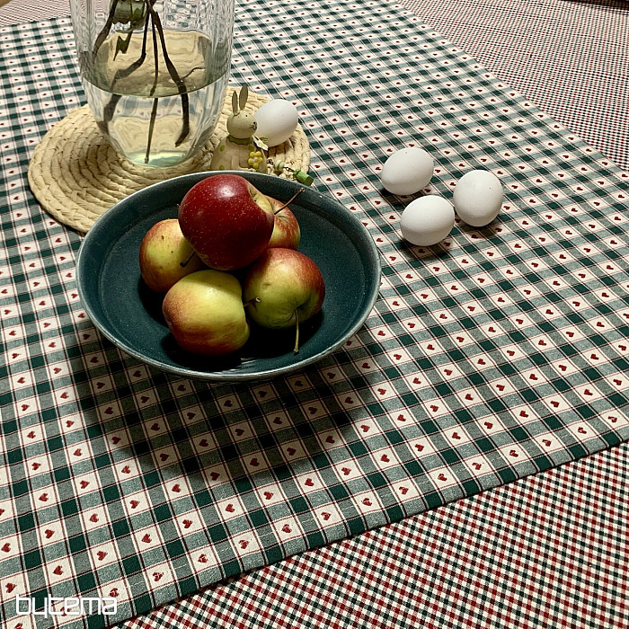 Una tovaglia decorativa e una sciarpa con motivo a quadri e a cuori sono perfette per i cottage di campagna e le baite in legno.