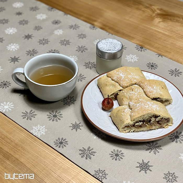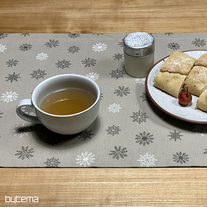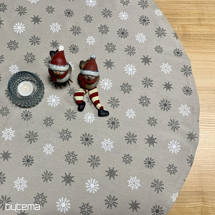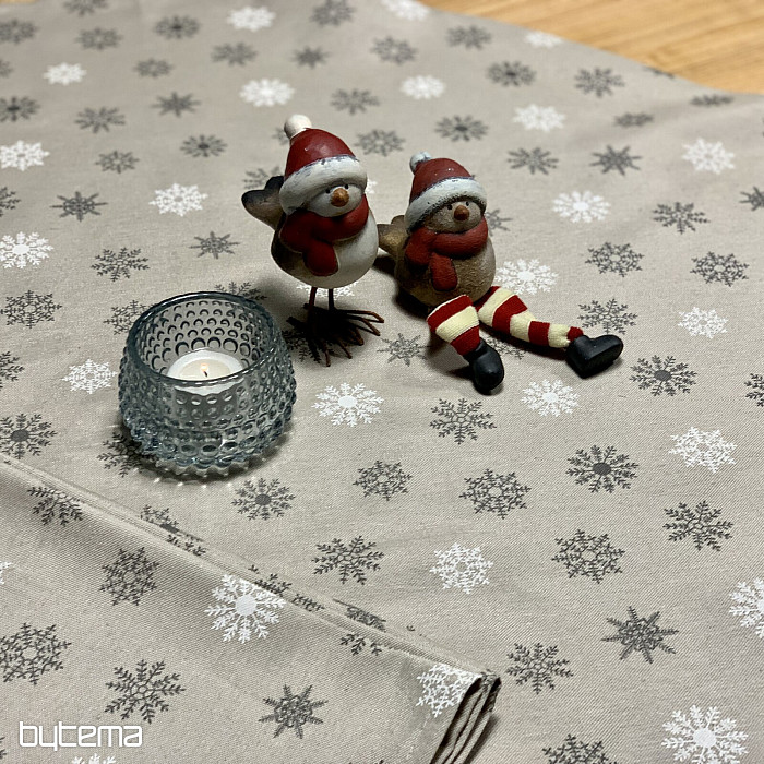 Le tovaglie e le sciarpe decorative natalizie con un disegno di bellissimi fiocchi di neve bianchi e grigi, grandi e piccoli, su sfondo rosso, saranno una decorazione magica per la tua casa.