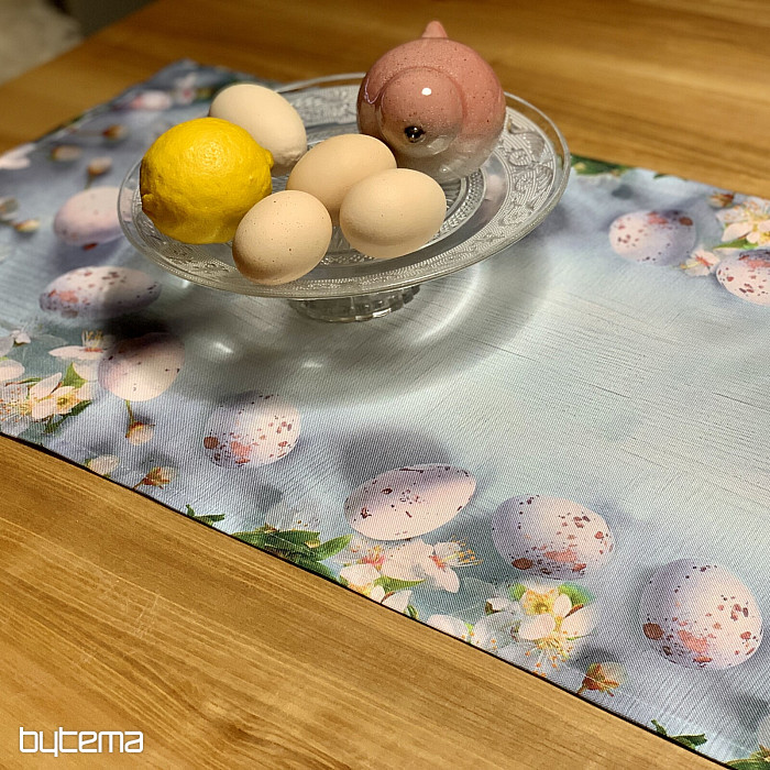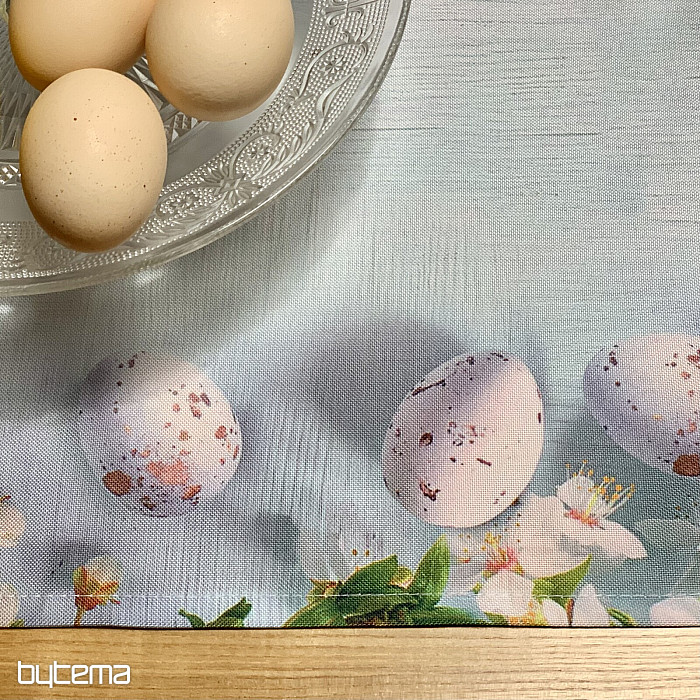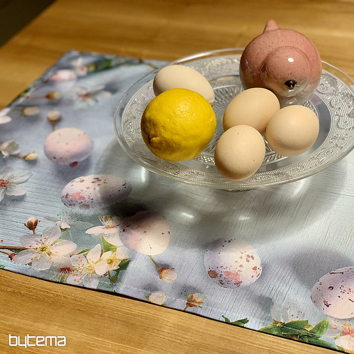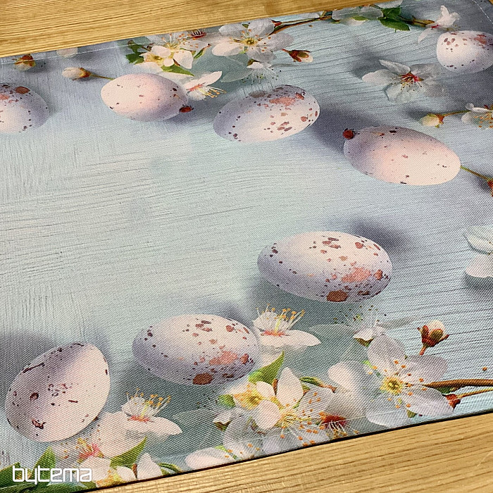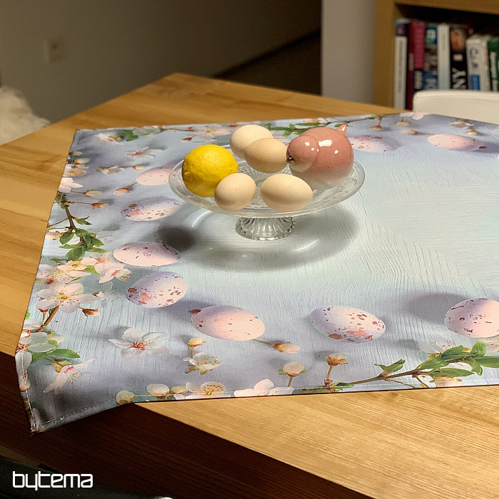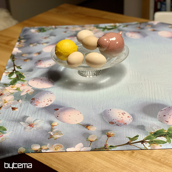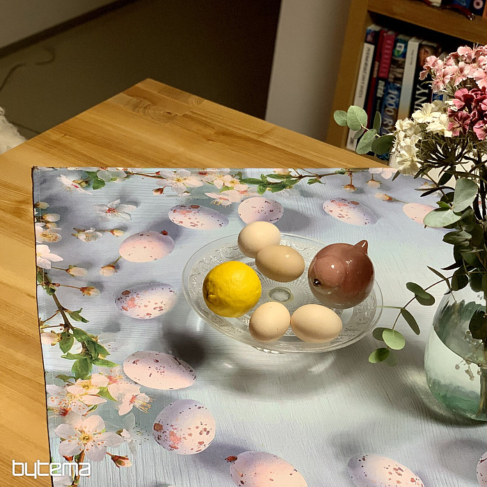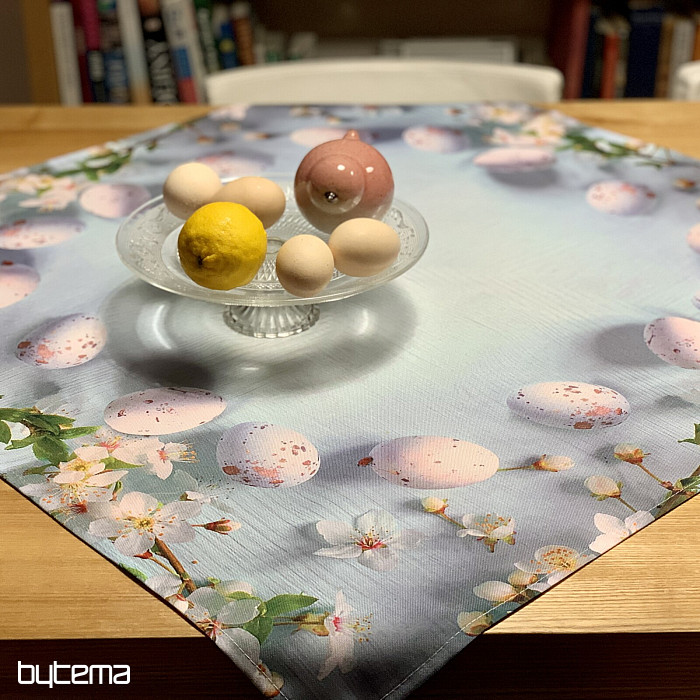 Tovaglie e sciarpe pasquali moderne e semplici con motivo di fiori di ciliegio e uova.