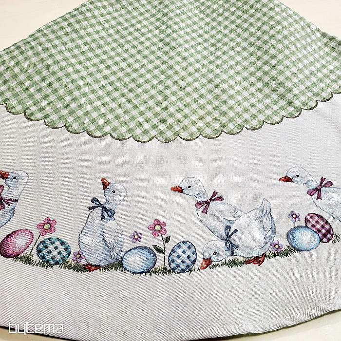Tovaglia rotonda pasquale con motivo a quadri verdi e oche. Una splendida decorazione per la tua tavola rotonda.