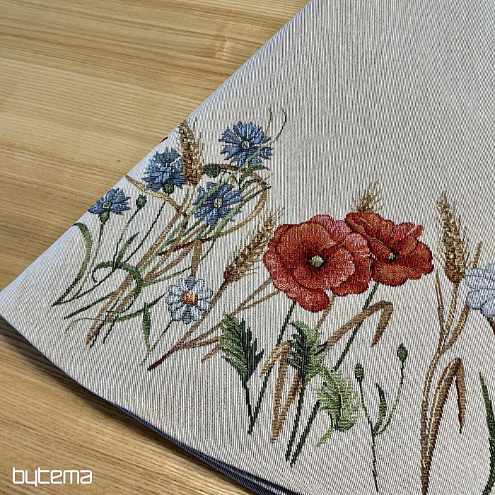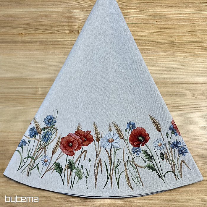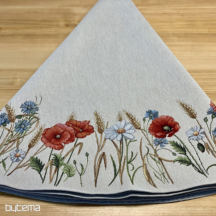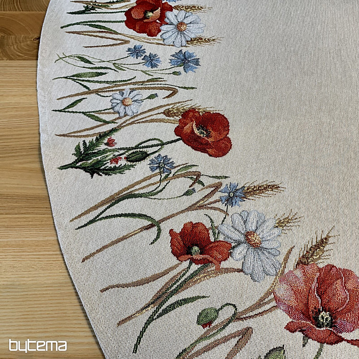 Una splendida tovaglia rotonda realizzata in robusto tessuto arazzo, con un tocco di giornate estive e fiori di campo. La morbidezza perfetta per le giornate estive sulla tua tavola di casa.