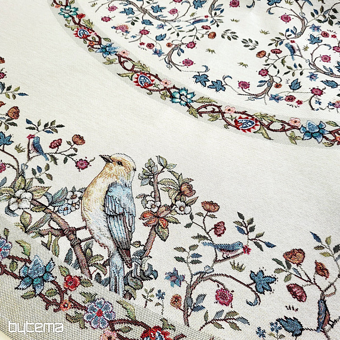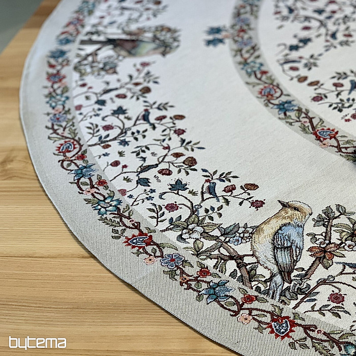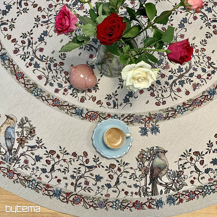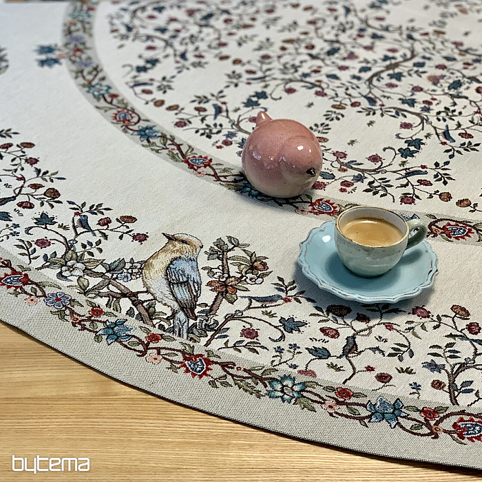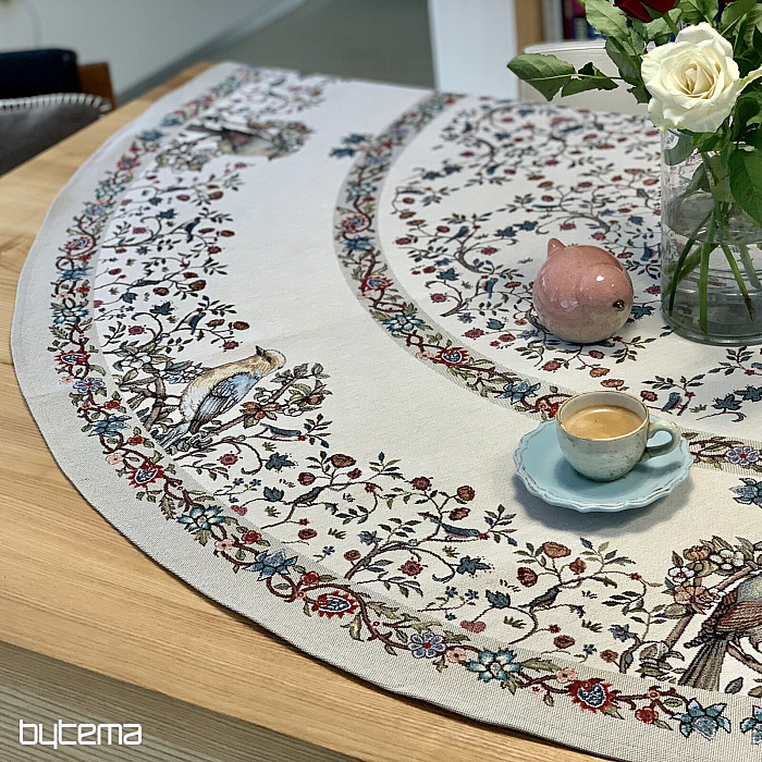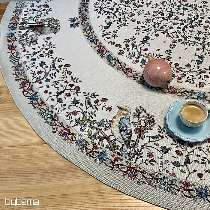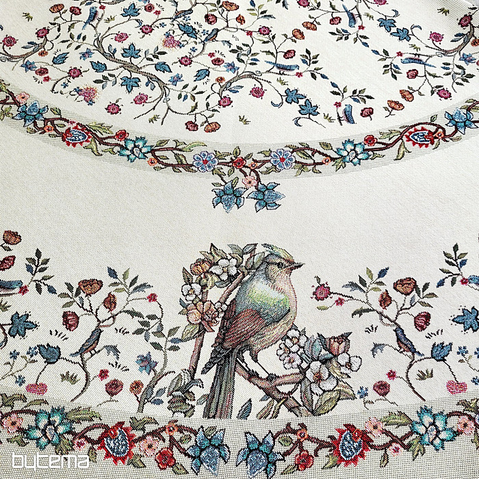 Una splendida tovaglia rotonda realizzata in robusto tessuto arazzo con uccelli e fiori in vari colori. Un accessorio o un regalo perfetto per gli amanti degli uccelli.